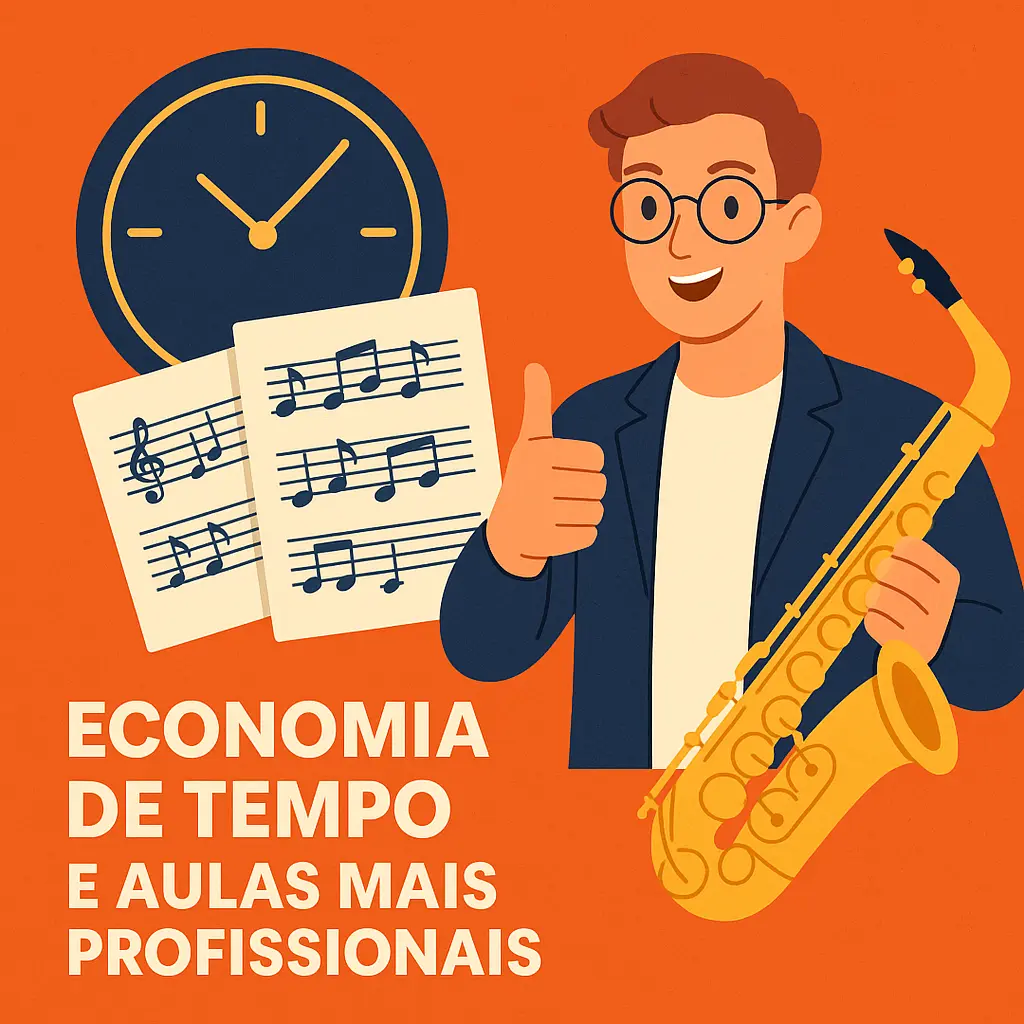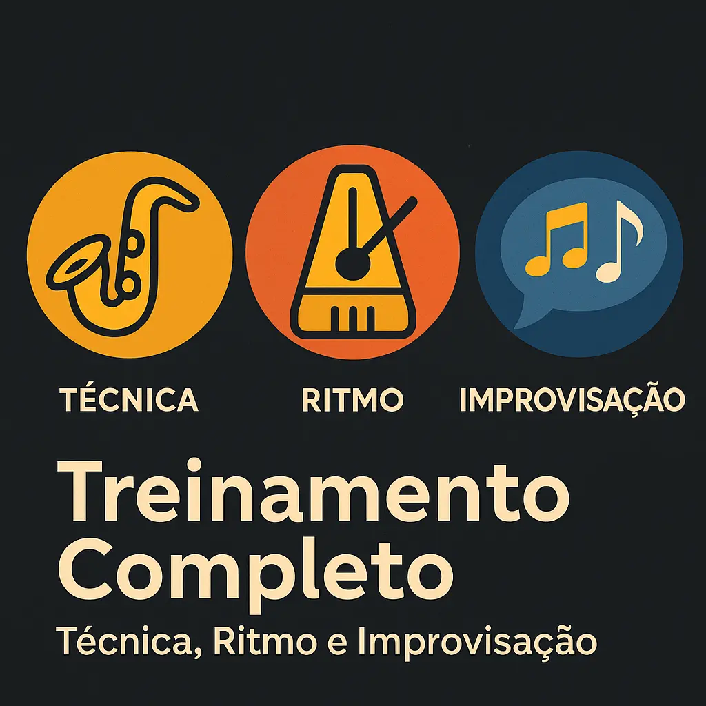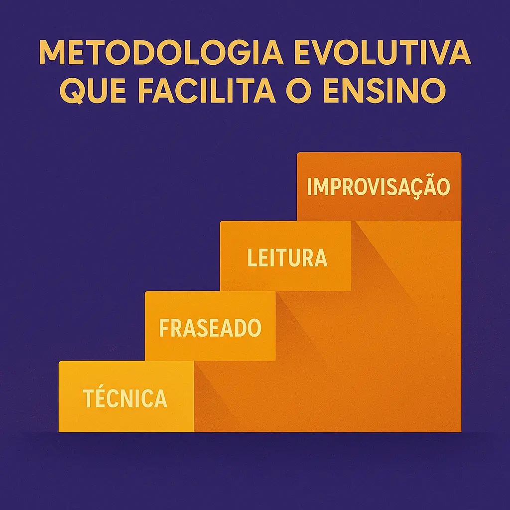 🥁 O aluno aprende desde embocadura e articulação até leitura rítmica, uso da chave de oitava, colcheias, ligaduras e improvisação sobre acordes.