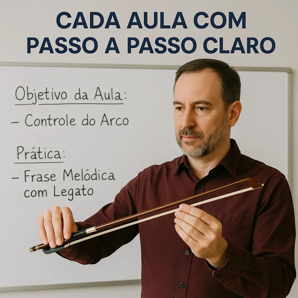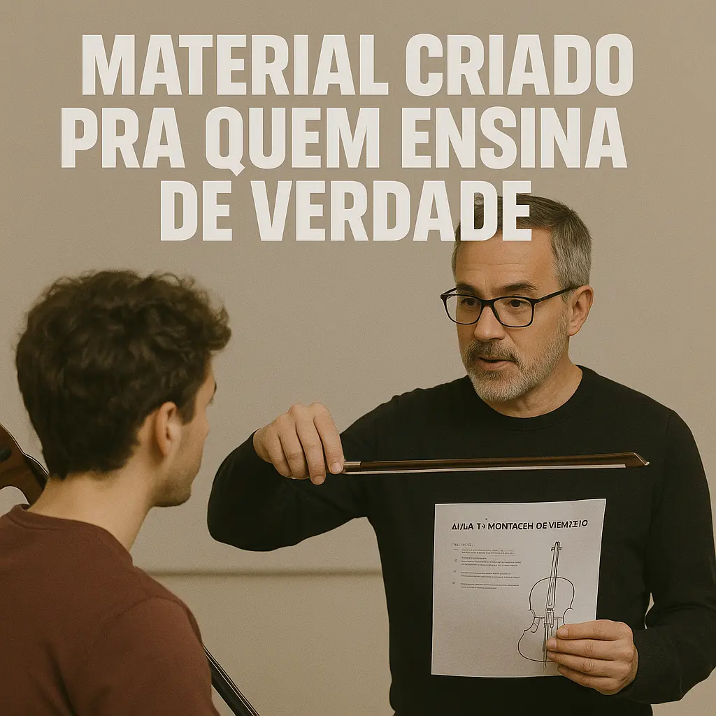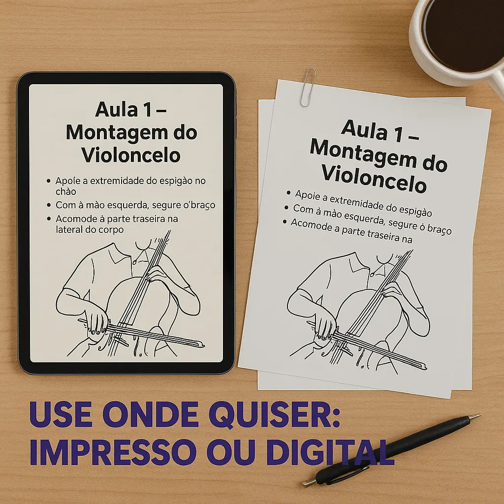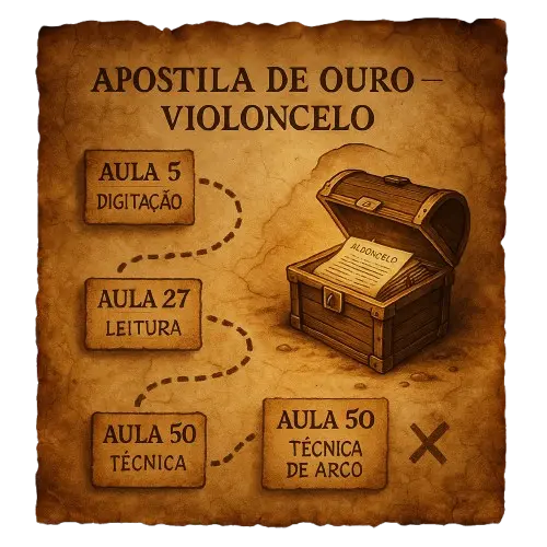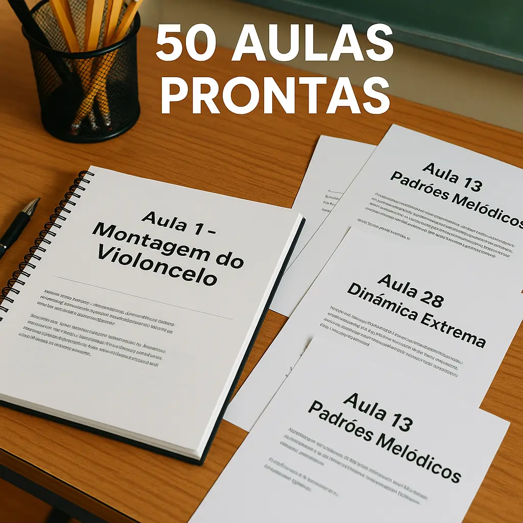 Você não vai mais perder horas tentando inventar sequência de aula. Está tudo aqui: do primeiro contato com o cello até vibratos expressivos, leitura rítmica, fraseado e interpretação musical.