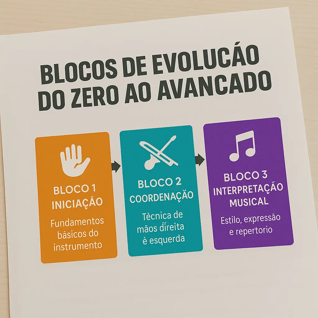 ✅ Conteúdo dividido em blocos pedagógicos por progressão técnica e musical